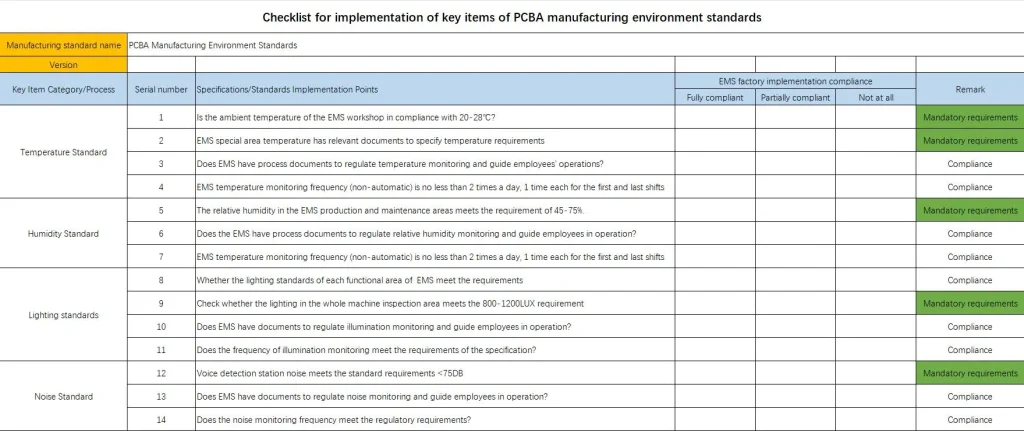 Relative humidity control requirements under normal conditions in manufacturing (including SMT, single board testing, whole machine assembly testing, etc.) and maintenance areas: 45%~75%; special production processes are performed separately according to the requirements of process standards
